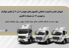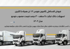 جزئیات طرح فروش قسطی کامیون فورس 6 و 12 تن بهمن دیزل اعلام شد شرکت بهمن دیزل طرح فروش قسطی کامیون فورس 6 و 12 تن را با مشارکت بانک تجارت برگزار میکند و متقضایان میتوانند از طریق عاملیتهای برای ...