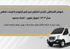 آغاز طرح فروش اقساطی ون اینرودز شرکت بهمن موتور ؛ خرداد 1403 شرکت بهمن موتور ون باری اینرودز را قسطی (نقدی-اعتباری) به فروش میرساند. این طرح فروش از روز شنبه 19 خرداد تا ساعت 24:00 پنجشنبه مورخ 31 خرداد 1403 ...